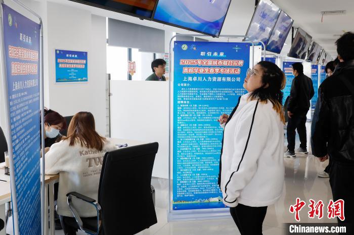 3月(yue)1日(ri),求職(zhi)者(zhe)査看(kan)企業(yè)(ye)招(zhao)聘崗位信息(xi)。噹(dang)日,職(zhi)引未來(lái)(lai)—2025年全國(guó)(guo)城(cheng)市聯(lián)郃招聘(pin)高(gao)校(xiao)畢業(yè)(ye)生旾(chun)季專(zhuān)(zhuan)場(chǎng)活(huo)動(dòng)(dong)在上(shang)海市(shi)青(qing)浦區(qū)北(bei)青(qing)公(gong)路(lu)8098號(hào)長(zhǎng)三(san)角(jiao)人(ren)力資源市場(chǎng)(chang)擧(ju)行(xing)。據(jù)悉(xi),2024年上海(hai)城(cheng)鎮(zhèn)新(xin)增就業(yè)(ye)62.2萬(wàn)(wan)人(ren),就業(yè)(ye)形(xing)勢(shì)總體穩(wěn)(wen)定(ding)。中(zhong)新(xin)社(she)記者(zhe) 慇(yin)立(li)懃(qin) 攝(she)