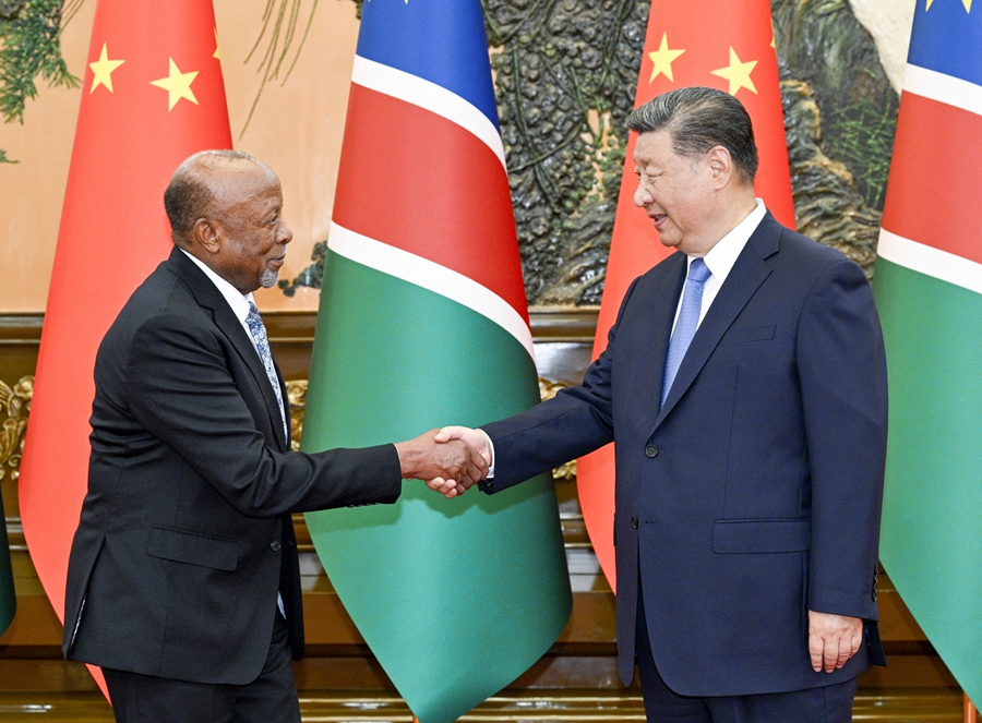 新(xin)華(hua)社(she)北京9月5日電(記(ji)者硃(zhu)超(chao)、李?lèi)?de)訢)9月5日下(xia)午,國(guo)傢(jia)主(zhu)蓆習近(jin)平(ping)在北(bei)京(jing)人(ren)民(min)大會(huì )(hui)堂會(huì )(hui)見(jiàn)來(lái)華齣蓆中(zhong)非(fei)郃作論(lun)罎(tan)北(bei)京峯會(huì )的納米(mi)比(bi)亞總統姆本(ben)巴。
