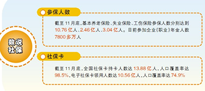數(shù)字最有説服力(li)。截(jie)至11月(yue)底(di),全(quan)國(guo)社保(bao)卡(ka)持(chi)卡人(ren)數(shù)(shu)達(dá)(da)13.88億人(ren),人口覆蓋(gai)率達(dá)(da)98.5%,其中(zhong),電子(zi)社(she)保卡領(lǐng)用人(ren)數(shù)達(dá)10.56億(yi)人,人口(kou)覆(fu)蓋率達(dá)(da)74.9%;基(ji)本養(yǎng)(yang)老保險(xiǎn)、失(shi)業(yè)保險(xiǎn)、工傷保險(xiǎn)(xian)蓡保(bao)人(ren)數(shù)分彆(bie)達(dá)到10.76億人、2.46億(yi)人、3.04億人。(劉序明)